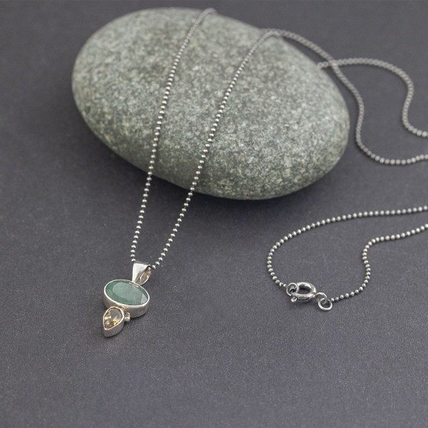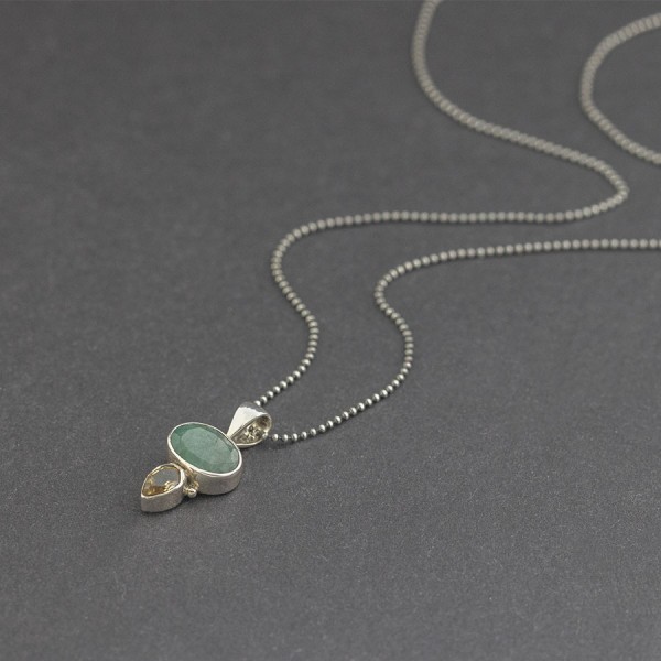 Wisiorek od podstaw wykonany został ręcznie ze srebra próby 925 z oprawionymi kamieniami szmaragdu (7x10 mm) i cytrynu (6x4 mm). Długość całkowita wisiorka 2,2 cm. Wisiorek zawiesiłam na drobnym oksydowanym łańcuszku długości 50 cm.