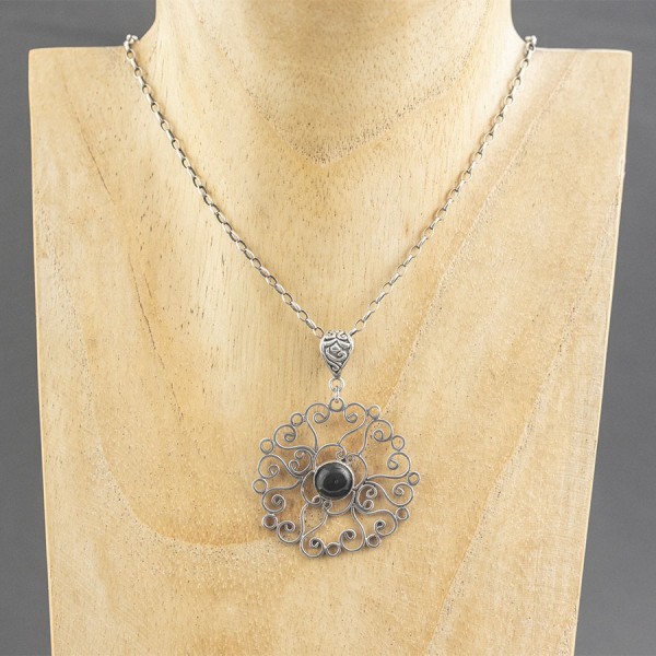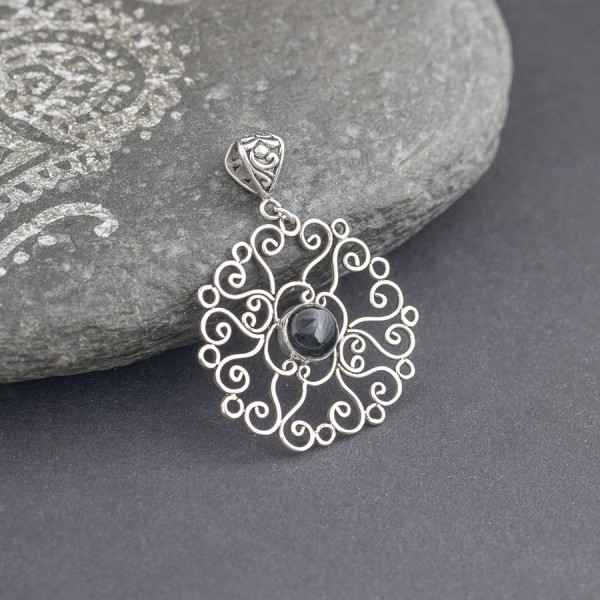 Ażurowy wisiorek od podstaw wykonany został ręcznie ze srebra próby 925 z oprawionym kamieniem onyksu. Wielkość kamienia 8 mm. Wielkość tarczy wisiorka 35 mm. Długość całkowita wisiorka 4,8 cm.