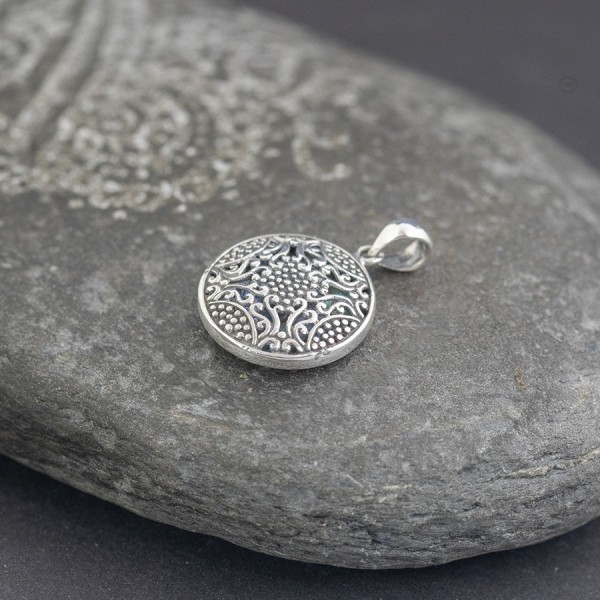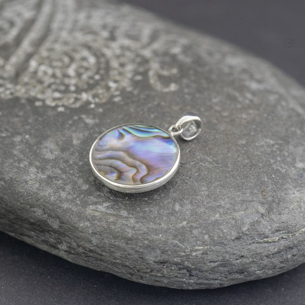 Wisiorek od podstaw wykonany został ręcznie ze srebra próby 925 z oprawioną muszlą paua. Wisiorek jest dwustronny. Z jednej strony posiada srebrne zdobienia a z drugiej ukazuje muszlę paua. Wielkość tarczy wisiorka 20 mm. Długość całkowita wisiorka 3 cm.