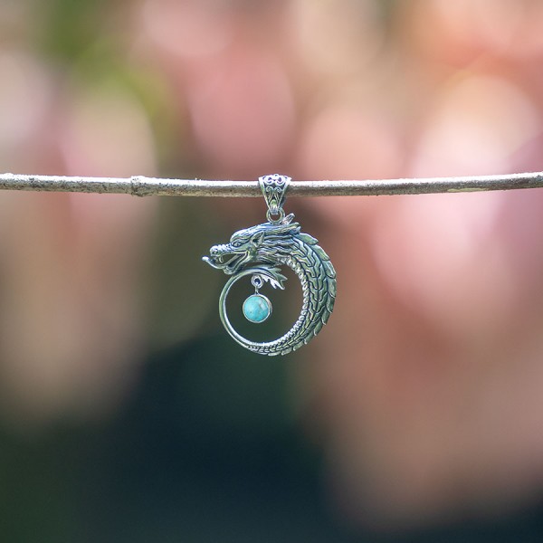 Kamień turkusu strzeżony przez smoka. Całość wykonana ręcznie ze srebra próby 925. Wielkość kamienia 6 mm. Wielkość tarczy wisiora 31x30 mm. Długość całkowita wisiora 4,1 cm.