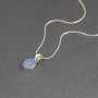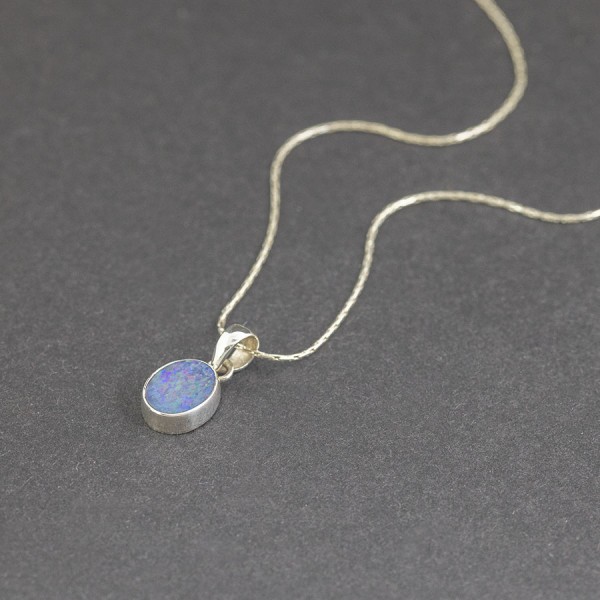 Wisiorek od podstaw wykonany został ręcznie ze srebra próby 925 z oprawionymi kamieniami opalu australijskiego (typu dublet). Wielkość tarczy wisiorka 8x10 mm. Długość całkowita wisiorka 1,7 cm. Wisiorek zawiesiłam na srebrnym łańcuszku długości 40 cm + 5 cm łańcuszka wydłużającego.
