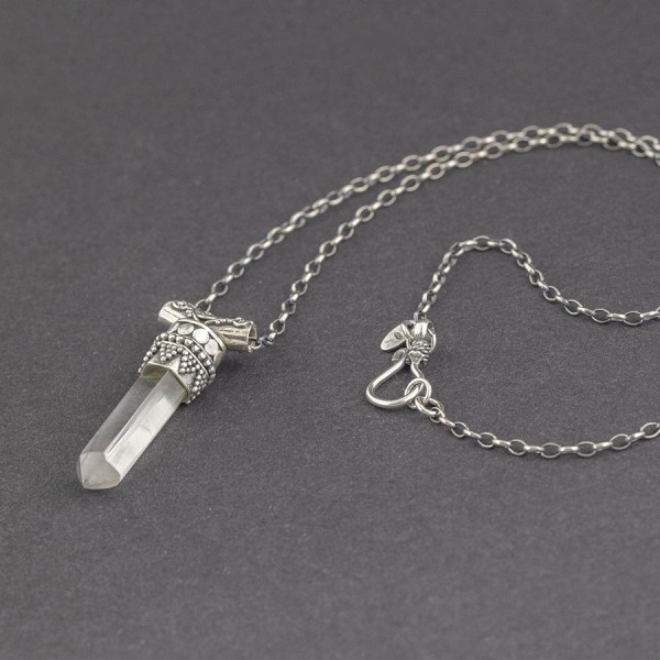 Naszyjnik od podstaw wykonany został ręcznie ze srebra próby 925 oraz kryształu górskiego. Wielkość wystającego kryształu 8x22 mm. Długość wisiorka 3,2 cm. Długość łańcuszka 45 cm.