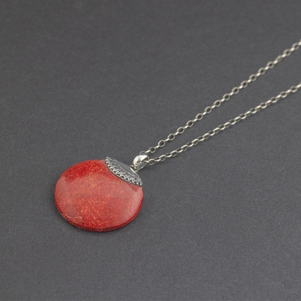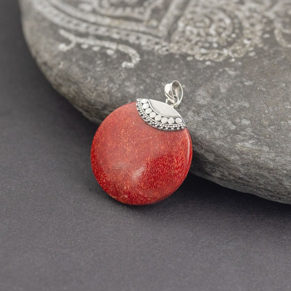 Wisiorek wykonany ze srebra próby 925 oraz czerwonego korala (30 mm). Długość całkowita wisiorka 4 cm. Całość zdobień wykonana została ręcznie.