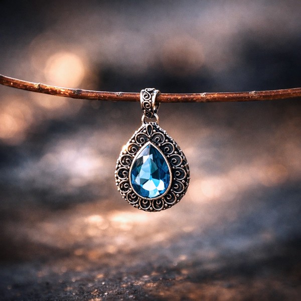 Wisiorek z oprawionym w srebro kamieniem topazu (12x18 mm) od podstaw wykonany ręcznie. Bok wisiorka ozdobiony został ręcznie wykonanym ornamentem. Wielkość tarczy wisiorka 22x29 mm. Długość całkowita wisiorka 3,9 cm.
