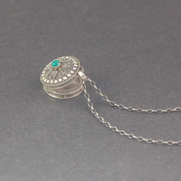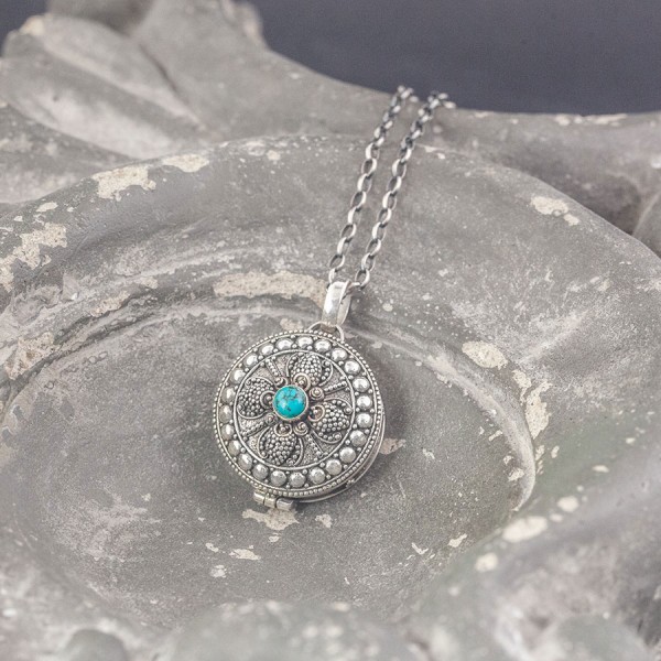Srebrny wisior w formie sekretnika, wykonany ręcznie, z misternie zdobioną powierzchnią i kamieniem turkusu (4 mm). Sekretnik jest otwierany, do środka można włożyć zdjęcie lub bliski nam przedmiot. Elementy wykończeniowe wykonane z oksydowanego srebra próby 925. Wielkość sekretnika 2,2 x 2,2 cm. Długość całkowita wisiora 3,2 cm. Doskonały na prezent dla bliskiej osoby.