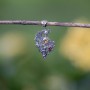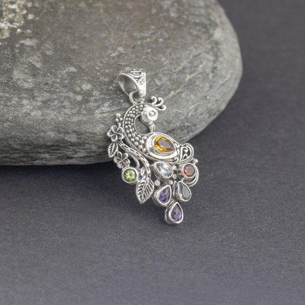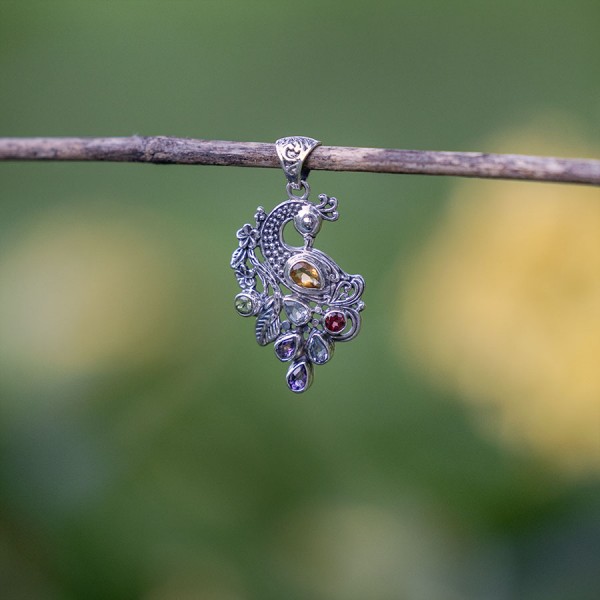 Wisiorek w formie rajskiego ptaka od podstaw wykonany ręcznie ze srebra próby 925. Całość ozdabiają kamienie: peridotu (3 mm), ametystu (5x3 mm), topazu (5x3 mm), granatu (3 mm), cytrynu (6x4 mm). Wielkość ptaka 32x22 mm. Długość całkowita wisiorka 4,3 cm.