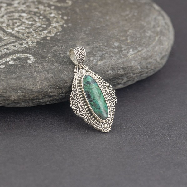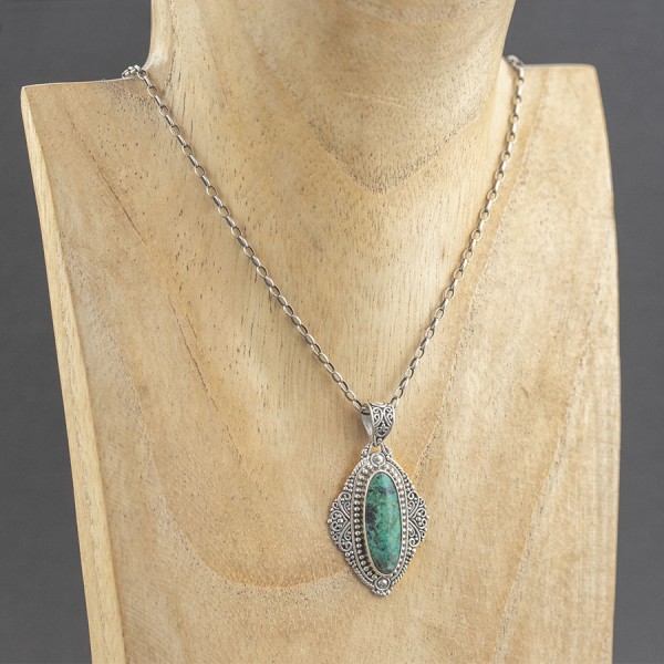 Wisiorek wykonany ze srebra próby 925 z oprawionym kamieniem turkusu. Wielkość kamienia 7x22 mm. Wielkość tarczy wisiorka 31x22 mm. Całość zdobień wykonana została ręcznie pracochłonną techniką granulacji. Długość całkowita wisiorka 4,2 cm.