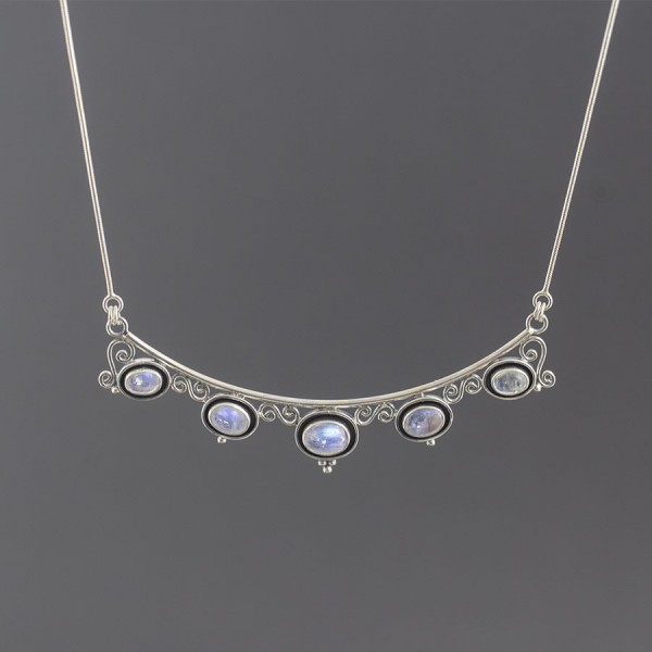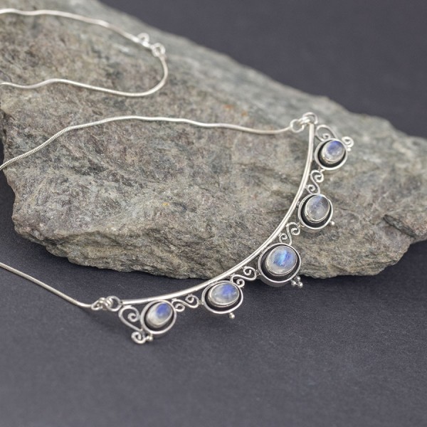 Naszyjnik z nutą orientu od podstaw wykonany został ręcznie ze srebra próby 925 z oprawionymi kamieniami księżycowymi. Wielkość kamieni 6x4 mm, 5x7 mm, 6x8 mm. Długość elementu z oprawionymi kamieniami 8 cm. Długość naszyjnika 50