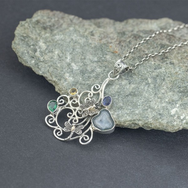 Wisiorek przywołujący wiosnę od podstaw wykonany ręcznie ze srebra próby 925. Wisiorek ozdabiają: cytryn (5 mm), iolit (5x7 mm), kwarc zielony (6x8 mm) oraz druza (14x13 mm). Dodatkowo pośród kamieni przysiadł motyl i ważka uszlachetnione 18-karatowym złotem. Wielkość tarczy wisiorka 47x42 mm. Długość całkowita wisiorka 6,1 cm.