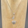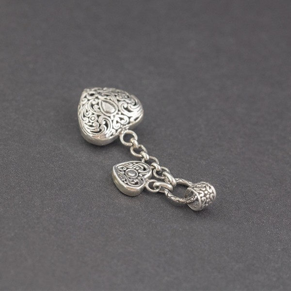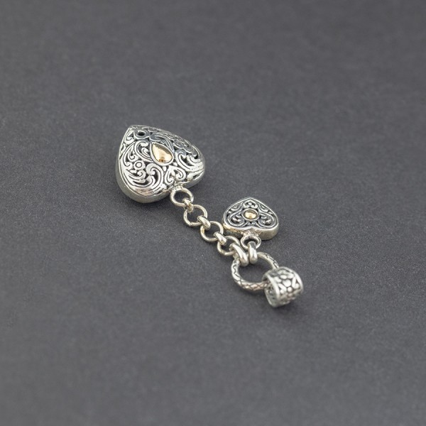 Wisiorek składający się z dwóch wiszących serc. Całość wykonana została ręcznie ze srebra próby 925 oraz 18-karatowego złota. Wielkość serc 17x18 mm i 12x11 mm. Długość całkowita wisiorka 5,5 cm. Wisiorek może być noszony dwustronnie ze złotem lub bez.