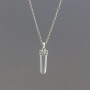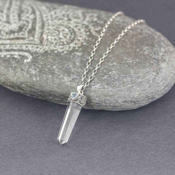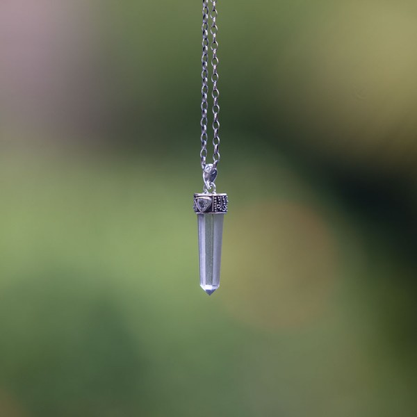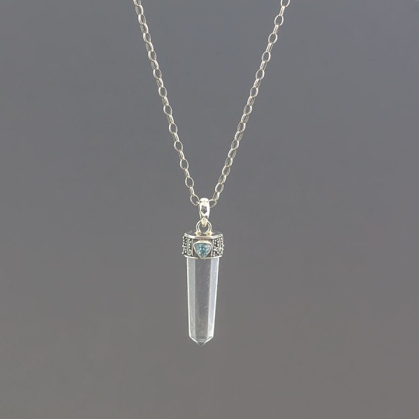Kryształ górski ubrany w srebro próby 925. Na szczycie wisiorek ozdobiony został kamieniem błękitnego topazu (4 mm). Całość zdobień wykonana ręcznie. Wielkość wystającego kryształu 26x8 mm. Długość całkowita wisiorka 4 cm.