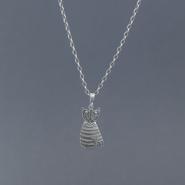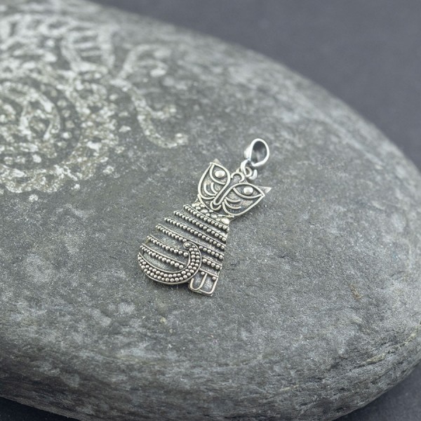 Drobny wisiorek z motywem kota od podstaw wykonany ze srebra próby 925. Całość zdobień wykonana została ręcznie, pracochłonną techniką granulacji. Wielkość kotka 13x25 mm. Długość całkowita wisiorka 3,4 cm.