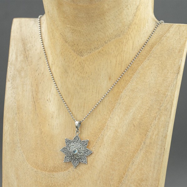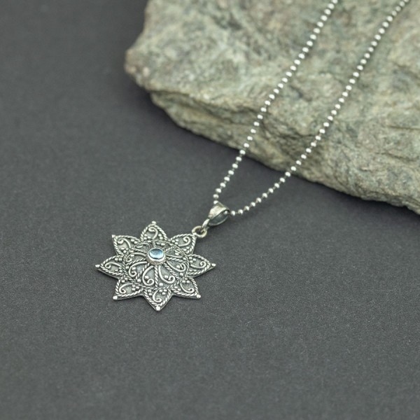 Wisiorek wykonany ze srebra próby 925 z oprawionym kamieniem błękitnego topazu (3 mm). Całość zdobień wykonana została ręcznie pracochłonną techniką granulacji. Wielkość tarczy wisiorka 23 mm. Długość całkowita wisiorka 3,3 cm. Wisiorek zawiesiłam na srebrnym łańcuszku. Długość łańcuszka 45 cm.