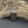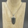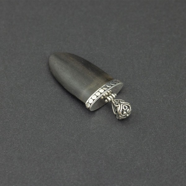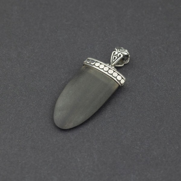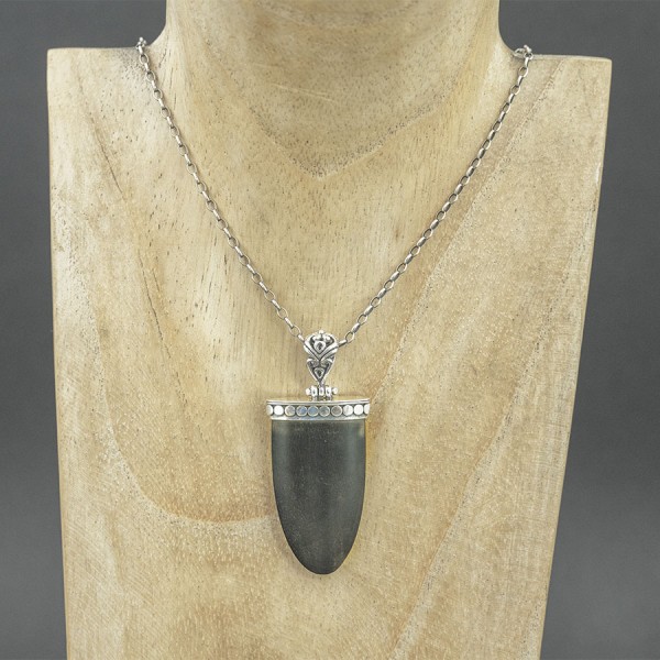 Wisiorek wykonany od podstaw ręcznie ze srebra próby 925 oraz hebanu. Wielkość tarczy wisiorka 41x22 mm. Długość całkowita wisiorka 5,6 cm.