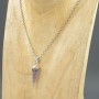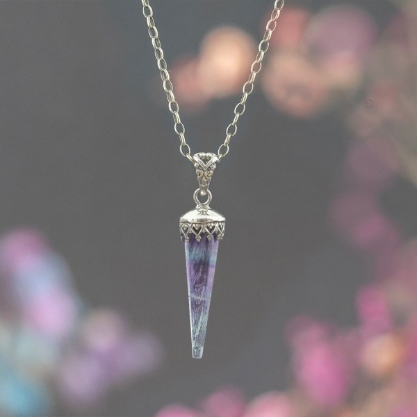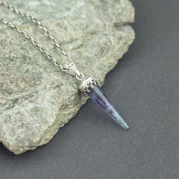 Kamień fluorytu ubrany w srebro próby 925. Całość zdobień wykonana ręcznie. Wielkość wisiorka 30x9 mm. Długość całkowita wisiorka 4,2 cm.