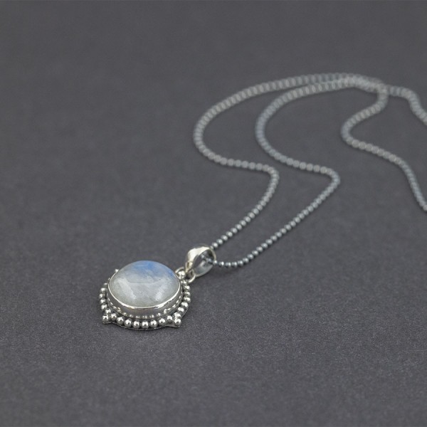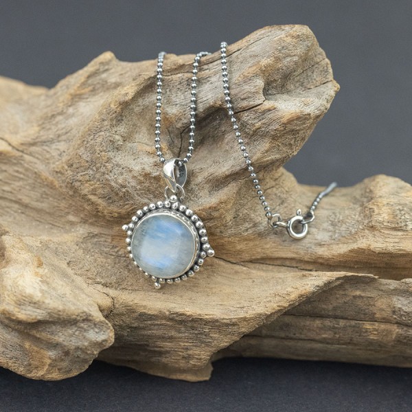 Wisiorek od podstaw wykonany ręcznie ze srebra próby 925 z oprawionym kamieniem księżycowym. Wielkość kamienia 13 mm. Wielkość tarczy wisiorka 18 mm. Długość wisiorka 2,9 cm. Wisiorek zawiesiłam na srebrnym, oksydowanym łańcuszku długości 43 cm. Na życzenie mogę sprzedać sam wisiorek bez łańcuszka.