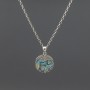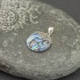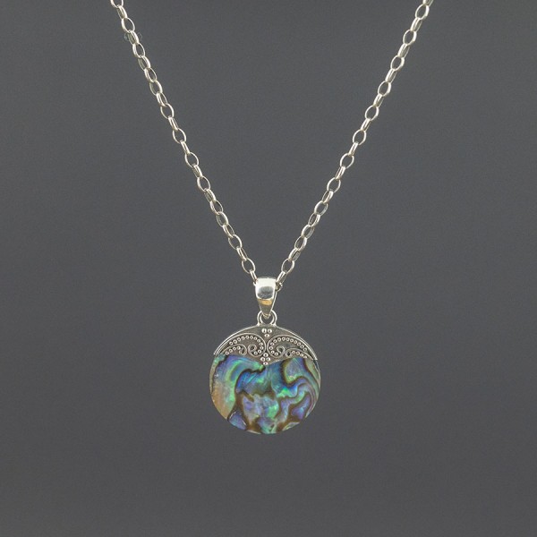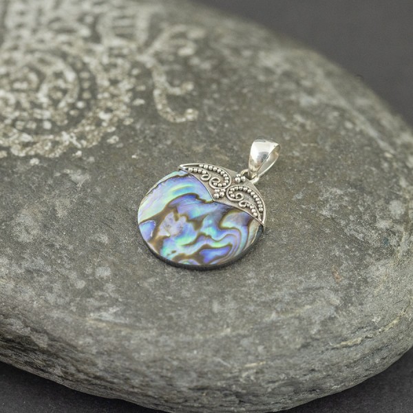 Wisior od podstaw wykonany ręcznie ze srebra próby 925 z oprawioną muszlą paua. Wielkość tarczy wisiorka 21 mm. Długość całkowita wisiorka 3 cm.
