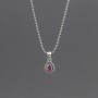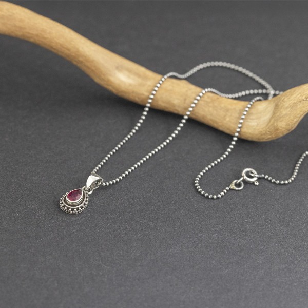 Delikatny wisiorek od podstaw wykonany ręcznie ze srebra próby 925 z oprawionym kamieniem rubinu. Wielkość kamienia 6x4 mm. Wielkość tarczy wisiorka 7,5x10 mm. Długość wisiorka 1,7 cm. Całość zdobień wykonana została ręcznie pracochłonną techniką granulacji. Wisiorek zawiesiłam na srebrnym łańcuszku długości 43 cm. Naszyjnik stworzony z myślą o Paniach lubiących drobną biżuterię.