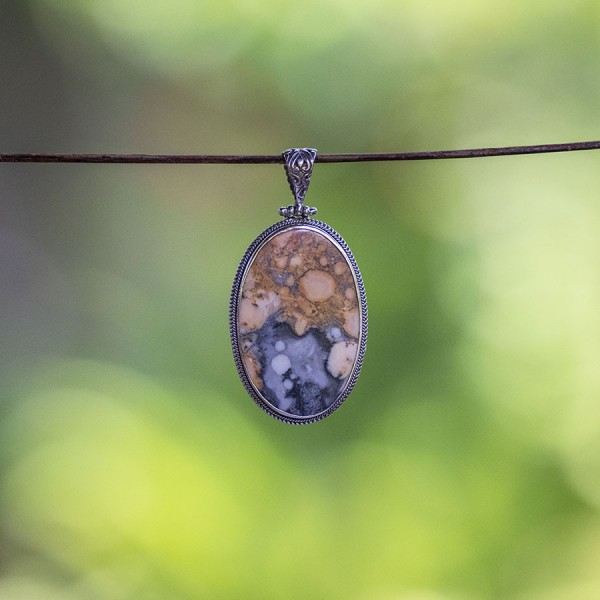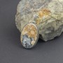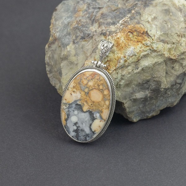 Kamień jaspisu (25x39) ubrany w srebro próby 925. Wielkość tarczy wisiorka 28x42 mm. Długość całkowita wisiorka 5,7 mm.