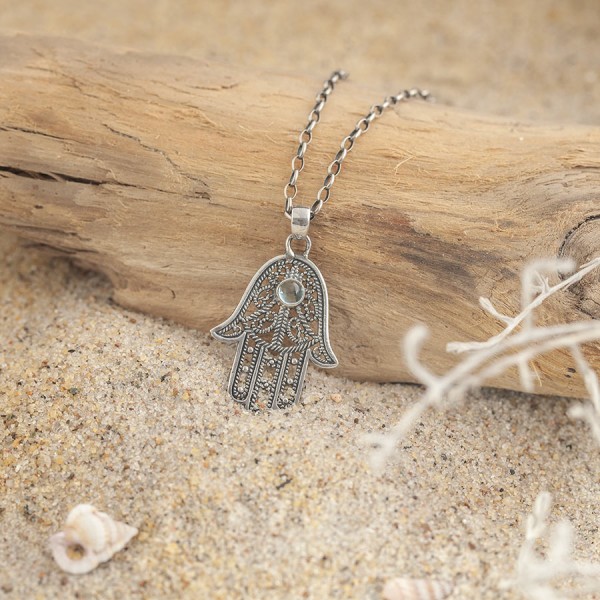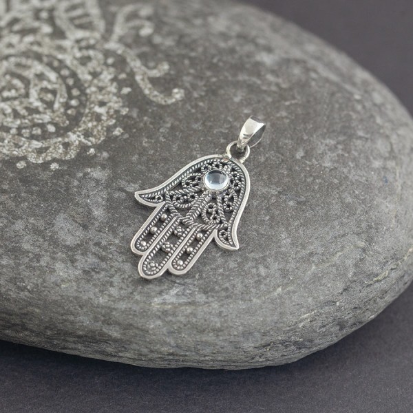 Delikatny, ażurowy wisiorek w kształcie „Ręki Fatimy” od podstaw wykonany ręcznie ze srebra próby 925 z oprawionym kamieniem błękitnego topazu. Wielkość kamienia 4 mm. Wielkość wisiorka 29x21 mm. Długość całkowita wisiorka 3,8 cm.