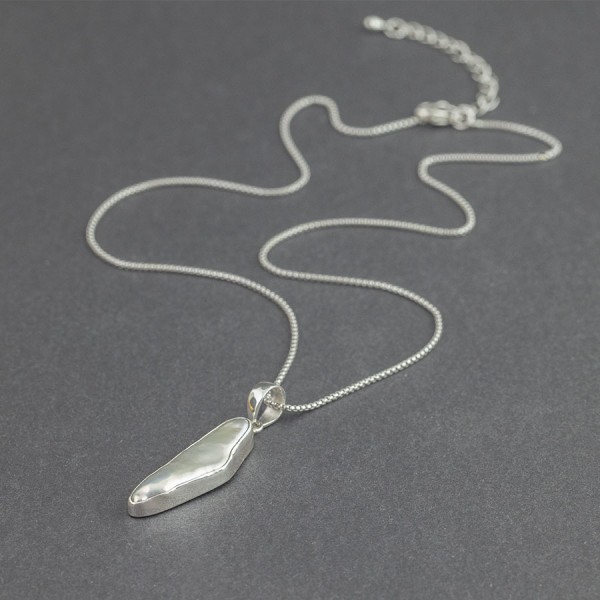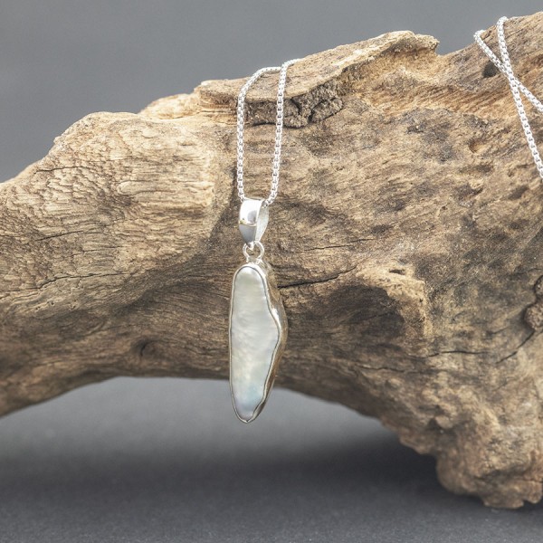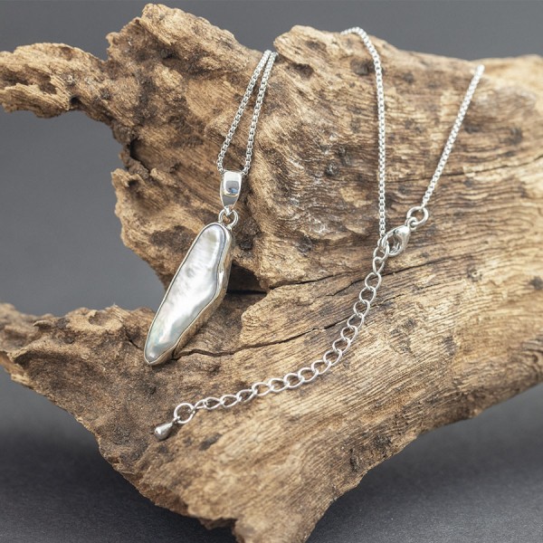 Wisiorek od podstaw wykonany został ręcznie ze srebra próby 925 z oprawiona perłą keshi. Wielkość traczy wisiorka 28x9,5 mm. Długość całkowita wisiorka 3,8 cm. Wisiorek zawiesiłam na srebrnym łańcuszku długości 41 cm + 5 cm łańcuszka wydłużającego. Na życzenie mogę sprzedać sam wisiorek bez łańcuszka.