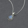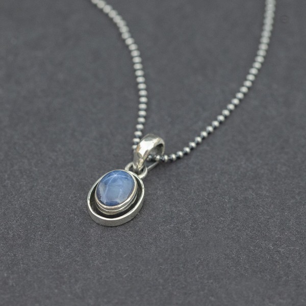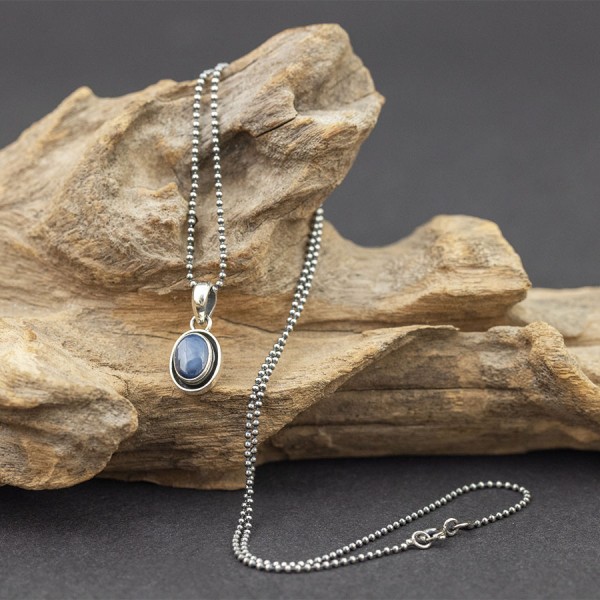 Wisiorek od podstaw wykonany ręcznie ze srebra próby 925 z oprawionym kamieniem szafiru gwiaździstego. Wielkość kamienia 6x8 mm. Wielkość tarczy wisiorka 9x11 mm. Długość wisiorka 1,9 cm. Wisiorek zawiesiłam na srebrnym łańcuszku długości 43 cm. Naszyjnik stworzony z myślą o Paniach lubiących drobną biżuterię. Na życzenie mogę sprzedać sam wisiorek bez łańcuszka.