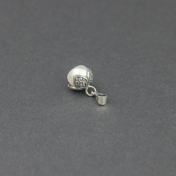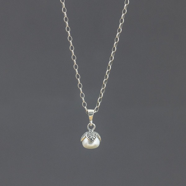 Biała perełka hodowlana ubrana w ręcznie zdobione srebro próby 925. Wielkość wisiorka 9x10 mm. Długość całkowita wisiorka 2 cm.