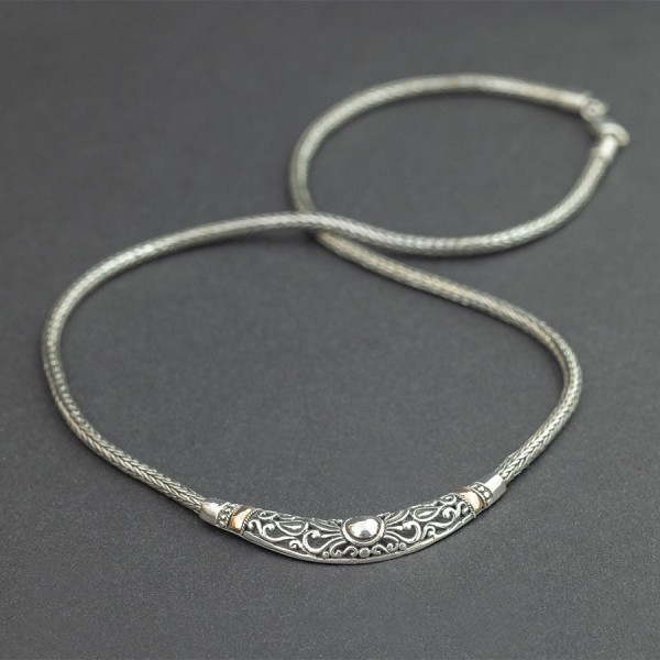 Ekskluzywny naszyjnik wykonany ręcznie ze srebra próby 925 oraz 18-karatowego złota. Wielkość ozdobnego elementu 48x8,5 mm. Grubość łańcuszka 2,5 mm. Długość całkowita naszyjnika 43,5 cm.
