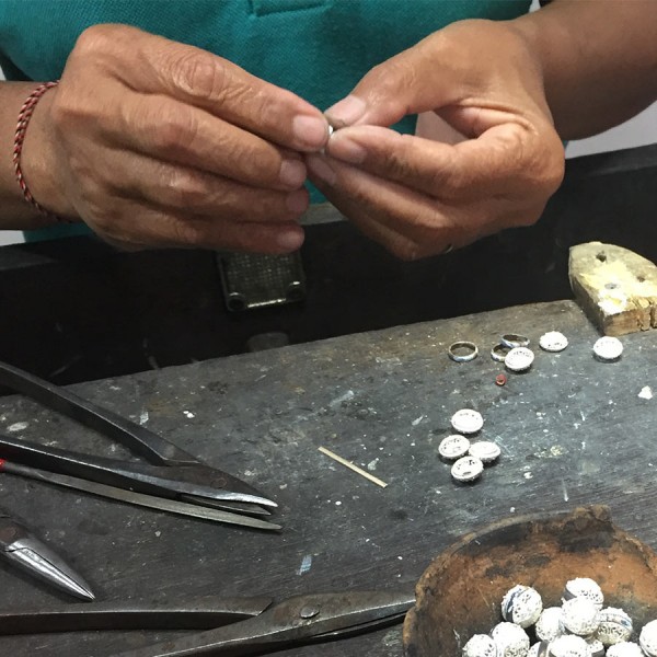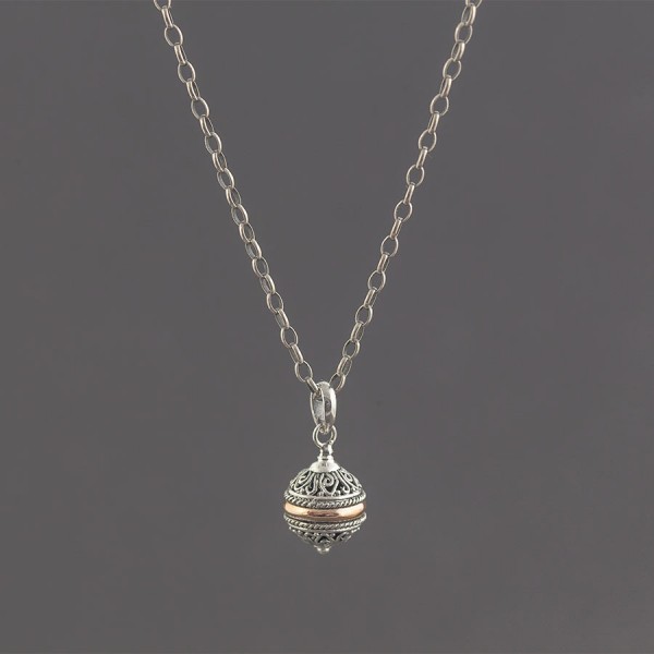 Wisiorek od podstaw wykonany ręcznie ze srebra próby 925 oraz 18-karatowego złota. Wielkość ażurowej kuleczki 11 mm. Długość całkowita wisiorka 2,3 cm.