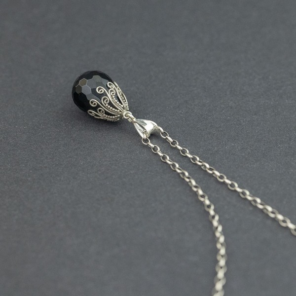 Kamień onyksu ubrany w srebro próby 925. Całość zdobień wykonana została ręcznie pracochłonną techniką granulacji. Wielkość kamienia 13x19 mm. Długość całkowita kolczyków 3 cm. Do kompletu polecam kolczyki 16890.