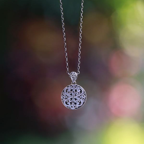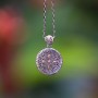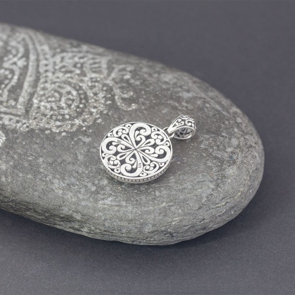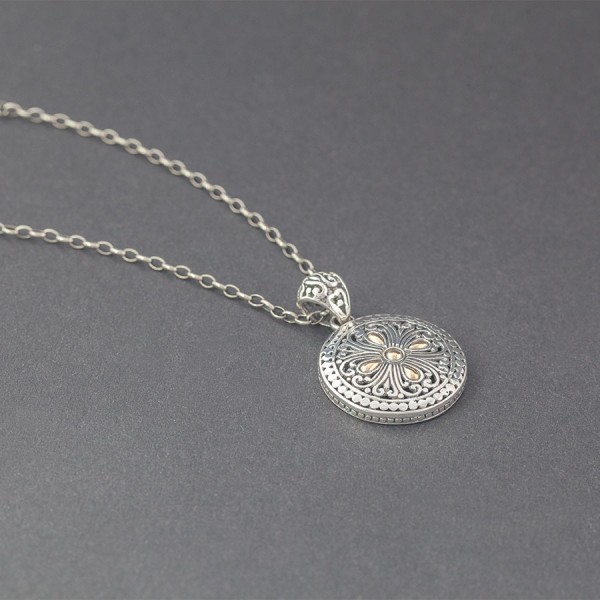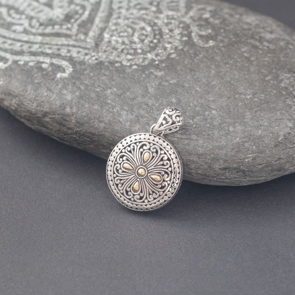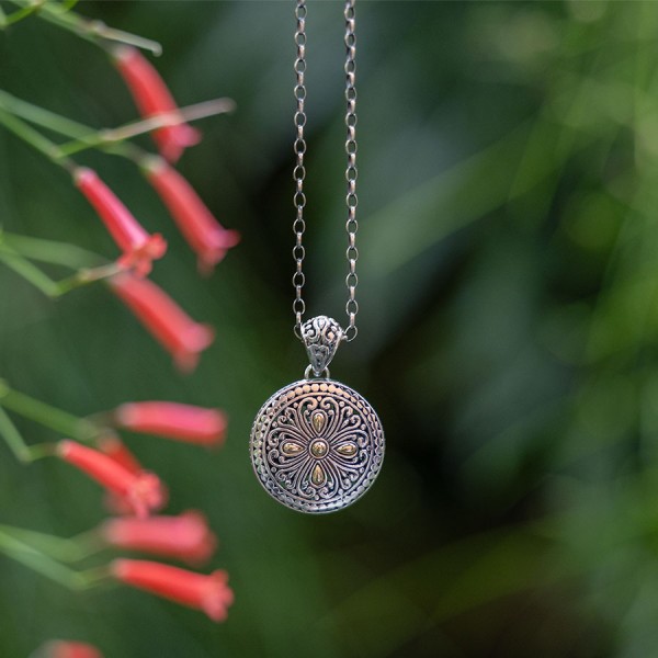 Wisiorek od podstaw wykonany ręcznie ze srebra próby 925 oraz 18-karatowego złota. Wielkość tarczy wisiorka 24 mm. Długość całkowita wisiorka 3,7 cm. Na uwagę zasługuje pięknie zdobiony tył wisiorka.