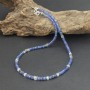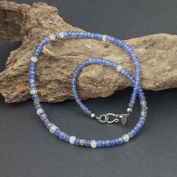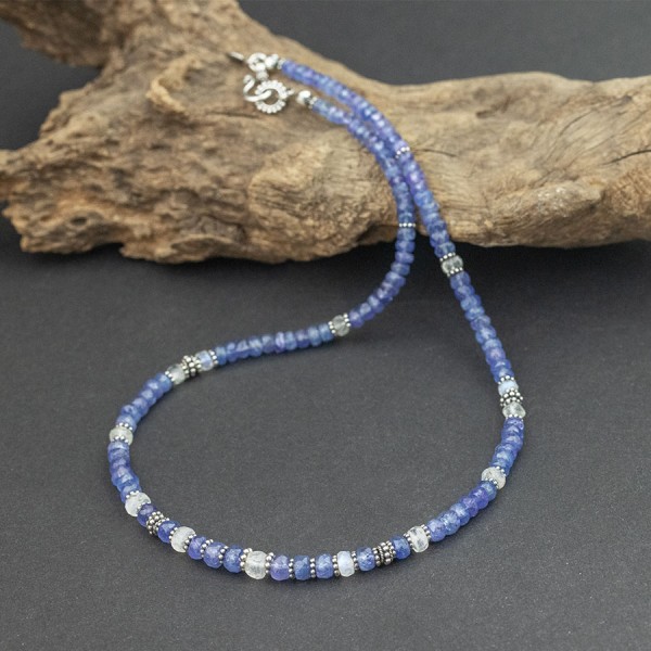 Elegancki naszyjnik od podstaw wykonany został ręcznie z kamieni tanzanitu (4-6 mm) i kamieni księżycowych (4,5-6 mm). Całość ozdobiona została ręcznie wykonanymi przekładkami bali. Długość naszyjnika 44,5 cm. Polecam z uwagi na niezwykłą urodę kamieni. Kamienie pięknie się mienia co trudno pokazać na zdjęciu.