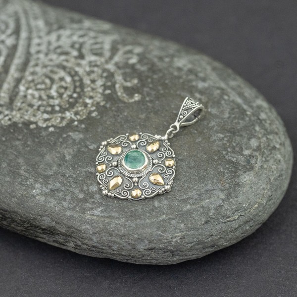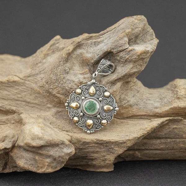 Wisiorek w formie medali od podstaw wykonany ręcznie ze srebra próby 925 oraz 18-karatowego złota. Pośrodku oprawiony został kamień szmaragdu (7 mm). Wielkość tarczy wisiorka 25x25 mm. Długość całkowita wisiorka 4,1 cm.