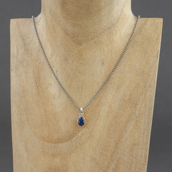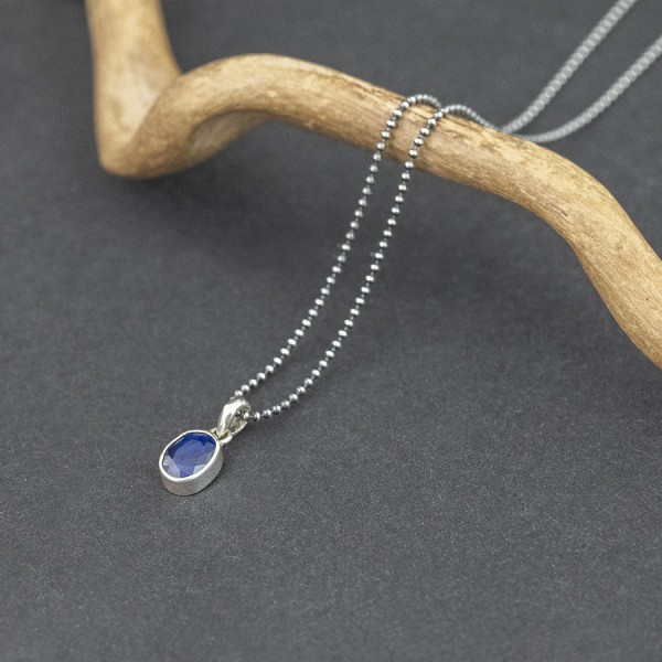 Wisiorek od podstaw wykonany został ręcznie ze srebra próby 925 z oprawionymi kamieniami szafiru (6x8 mm). Długość całkowita wisiorka 1,6 cm. Wisiorek zawiesiłam na drobnym oksydowanym łańcuszku długości 40,5 cm.