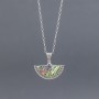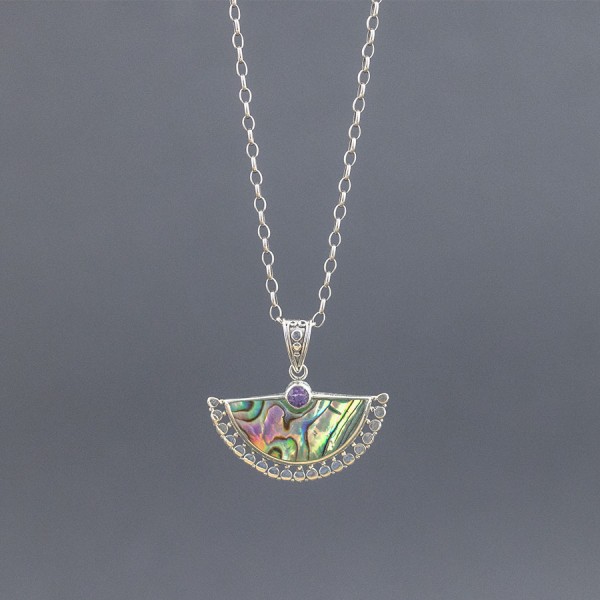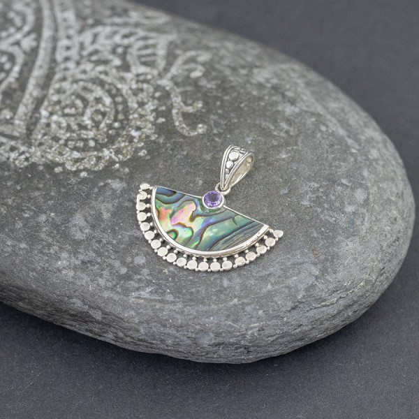 Wisiorek od podstaw wykonany został ręcznie ze srebra próby 925 z oprawioną muszlą paua (11x25 mm). U góry ozdobione zostały kamieniem ametystu (4 mm). Wielkość tarczy wisiorka 33x19 mm. Długość całkowita wisiorka 3 cm.