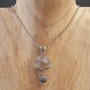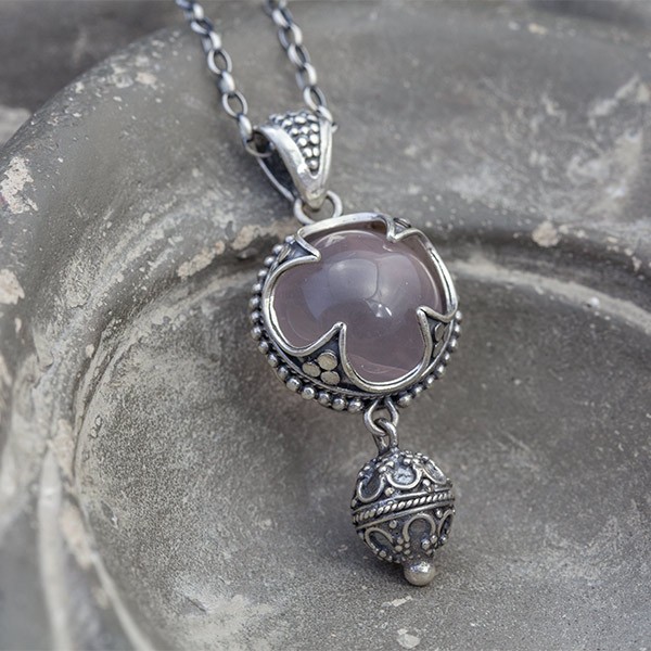 Kwarc różowy ubrany w pięknie zdobione srebro próby 925. Wielkość kamienia 16 mm. Wielkość kuleczki bali 10 mm. Kamień obraca się w srebrnej oprawie. Długość całkowita wisiorka 4,9 cm. Wisior zawiesiłam na długim łańcuszku zakończonym ozdobnym zapięciem bali. Długość łańcuszka 70 cm.