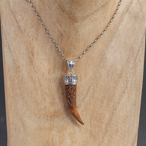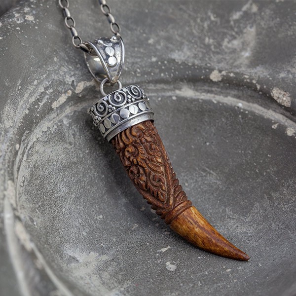 Wisior ręcznie wyrzeźbiony w drewnie i oprawiony w srebro próby 925. Wielkość wisiorka 4,5 x 11 mm. Długość całkowita wisiorka 5,8 cm.