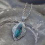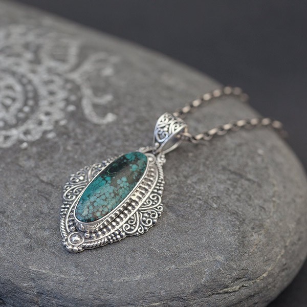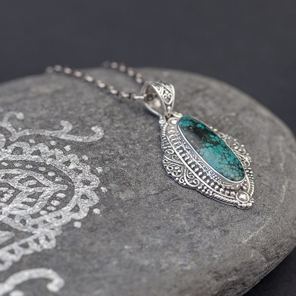Wisiorek od podstaw wykonany ręcznie ze srebra próby 925 oraz turkusu. Wielkość kamienia 22x8 mm. Wielkość tarczy wisiorka 31x22 mm. Długość całkowita wisiorka 4,1 cm.