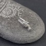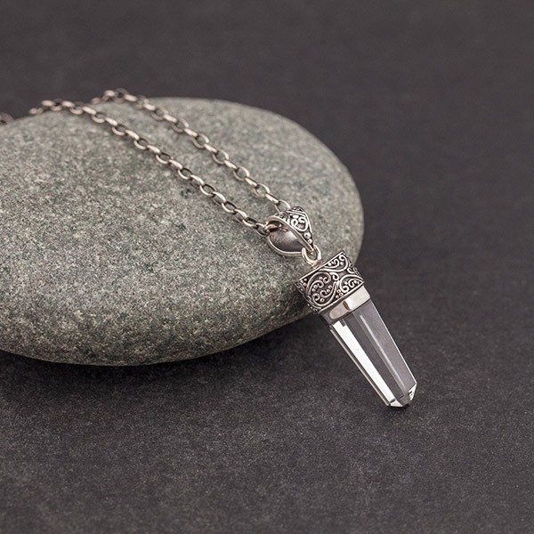 Kryształ górski ubrany w srebro próby 925. Całość zdobień wykonana ręcznie. Wielkość wystającego kryształu 18x8 mm. Długość całkowita wisiorka 3,8 cm.