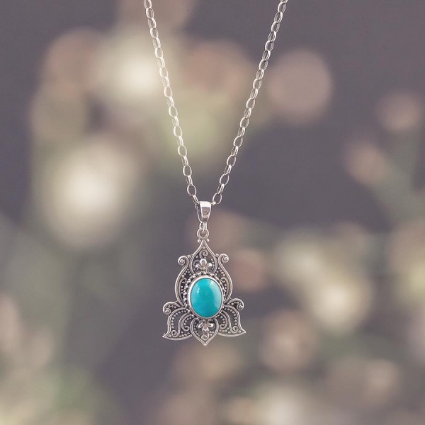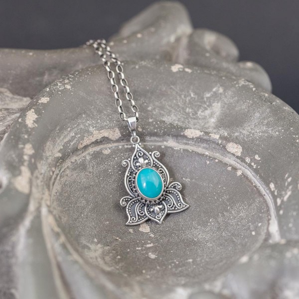 Wisiorek od podstaw wykonany ręcznie ze srebra próby 925 z oprawionym kamieniem turkusu. Całość zdobień wykonana została ręcznie pracochłonną techniką granulacji. Wielkość kamienia 8x10 mm. Długość całkowita wisiorka 3,6 cm.