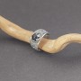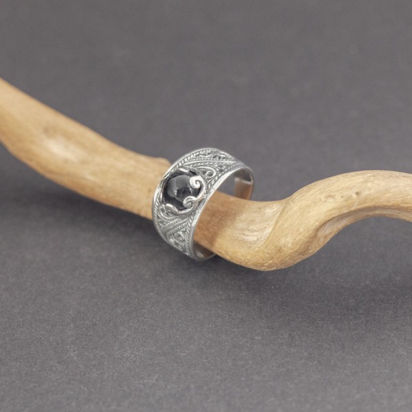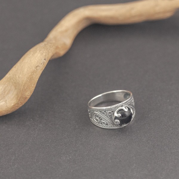 Pierścionek od podstaw wykonany ręcznie ze srebra próby 925 z oprawionym kamieniem onyksu. Wielkość kamienia 7 mm. Szerokość pierścionka w najszerszym miejscu 11 mm; najwęższym 3,5 mm. Rozmiar jubilerski 15.