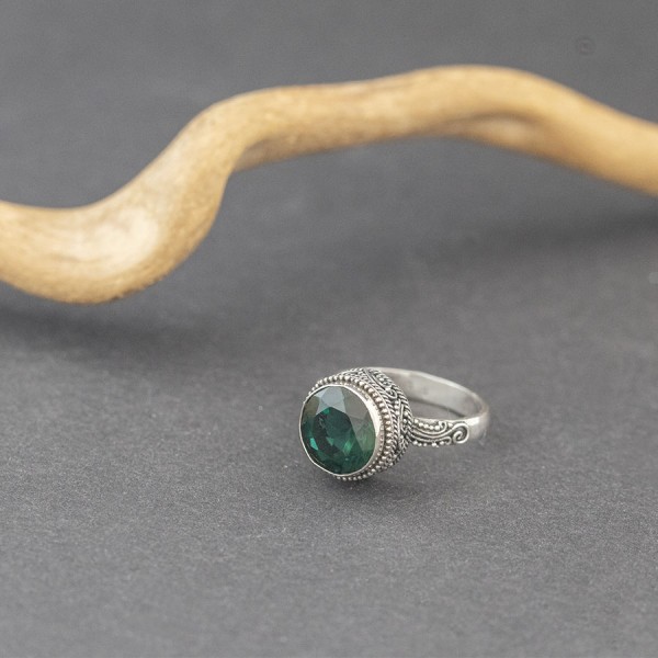 Elegancki pierścionek wykonany ze srebra próby 925 z oprawionym kamieniem kwarcu zielonego (11 mm). Kamień ozdobiony został ręcznie wykonanym ornamentem. Wielkość tarczy pierścionka 13 mm. Szerokość obrączki 3,5 mm. Pierścionek występuje w rozmiarze jubilerskim 20.