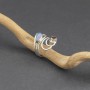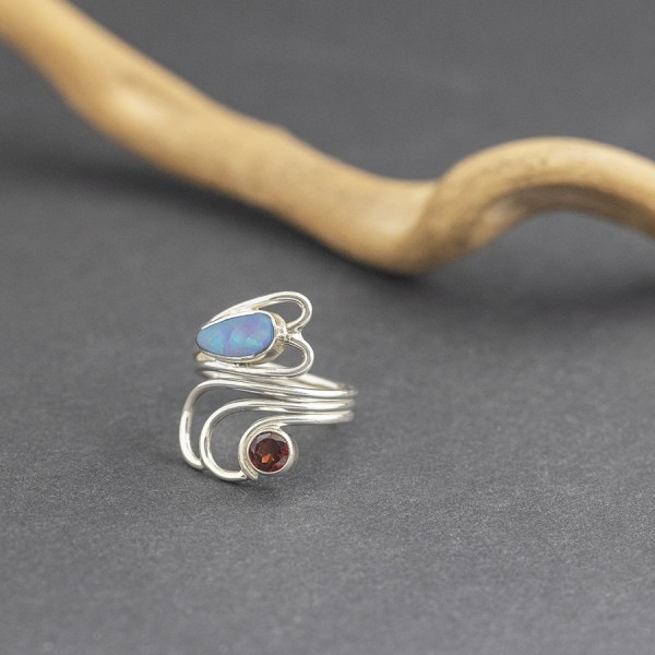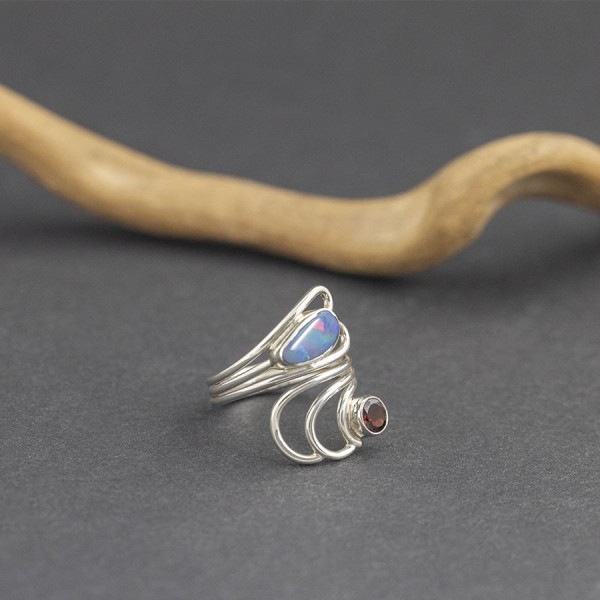 Pierścionek od podstaw wykonany ręcznie ze srebra próby 925 z oprawionym kamieniem opalu australijskiego (typu dublet 5x10 mm) i granatu (5 mm). Szerokość pierścionka w najszerszym miejscu 21 mm. Rozmiar jubilerski 15 (pierścionek jest regulowany więc można dopasować do palca).