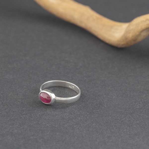 Pierścionek od podstaw wykonany ręcznie ze srebra próby 925 z oprawionym kamieniem rubinu. Wielkość kamienia 5x7 mm. Szerokość obrączki 2,5 mm. Rozmiar jubilerski 12.