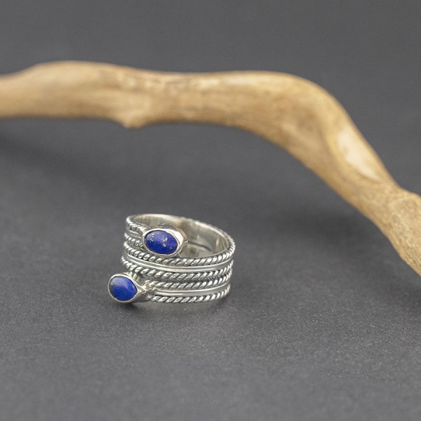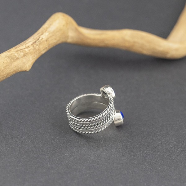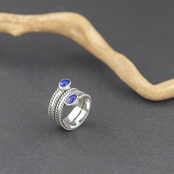 Pierścionek od podstaw wykonany został ręcznie ze srebra próby 925 z oprawionymi kamieniami lapisu lazuli. Wielkość kamieni (5x7 mm). Szerokość pierścionka w najszerszym miejscu 15 mm. Rozmiar jubilerski 16.