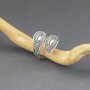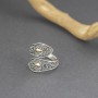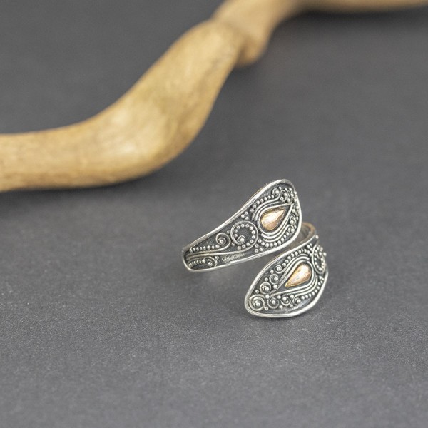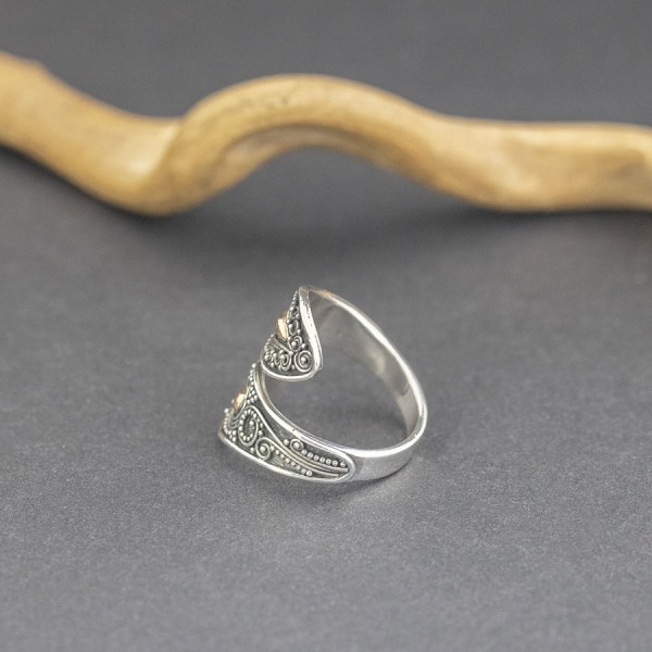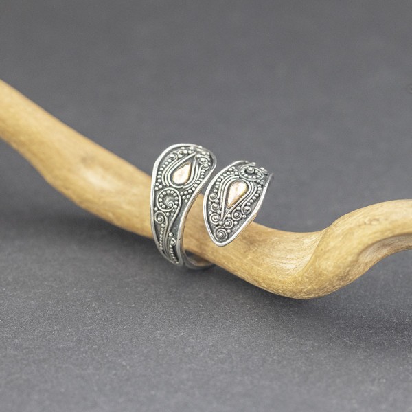 Srebrny pierścionek w stylu bali z pięknie zdobioną powierzchnią. Całość zdobień wykonana ręcznie ze srebra próby 925 oraz 18-karatowego złota. Szerokość pierścionka w najszerszym miejscu 22 mm. Pierścionek jest regulowany (można go regulować w przedziale rozmiarowym 19-20).