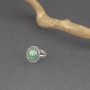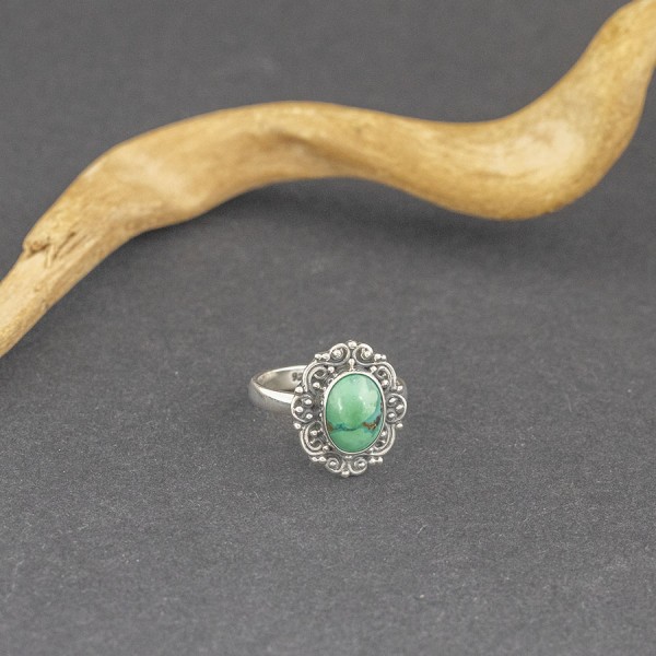 Pierścionek w orientalnym stylu od podstaw wykonany ręcznie ze srebra próby 925 z oprawionym kamieniem turkusu. Wielkość kamienia 10x7 mm. Wielkość tarczy pierścionka 17x15 mm. Całość zdobień wykonana została ręcznie pracochłonną techniką granulacji. Pierścionek występuje w rozmiarze jubilerskim 15.
