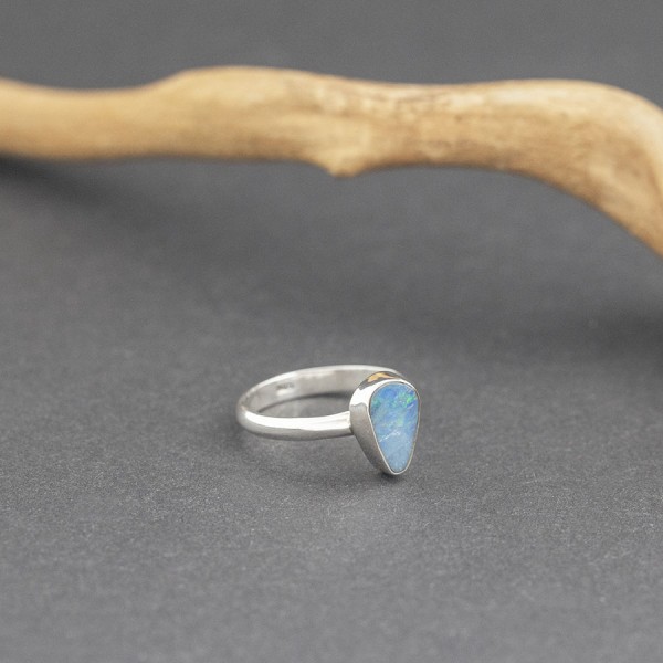 Pierścionek od podstaw wykonany ręcznie ze srebra próby 925 z oprawionym kamieniem opalu australijskiego (typu dublet). Wielkość kamienia 7x11 mm. Wielkość tarczy pierścionka 12x8 mm. Rozmiar jubilerski 19,5.