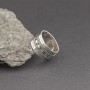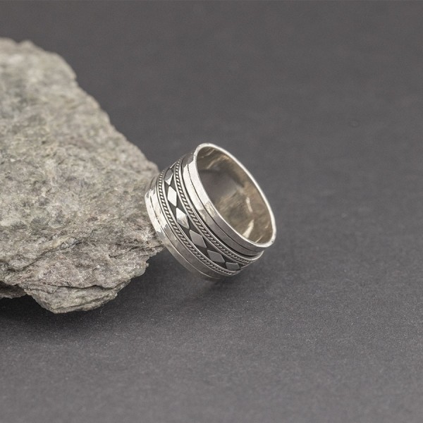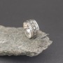 Obrączka w stylu orientalnym wykonana ze srebra próby 925. Całość zdobień wykonana ręcznie. Ozdobny element obrączki ruchomy, obraca się wokół obrączki. Szerokość obrączki 13 mm. Rozmiar jubilerski 25.