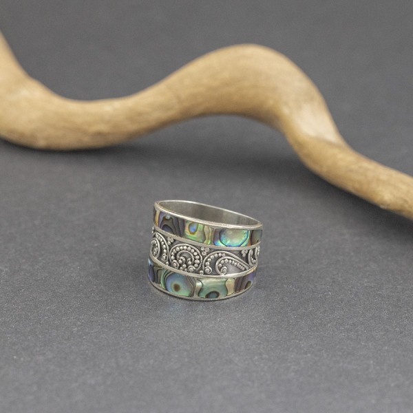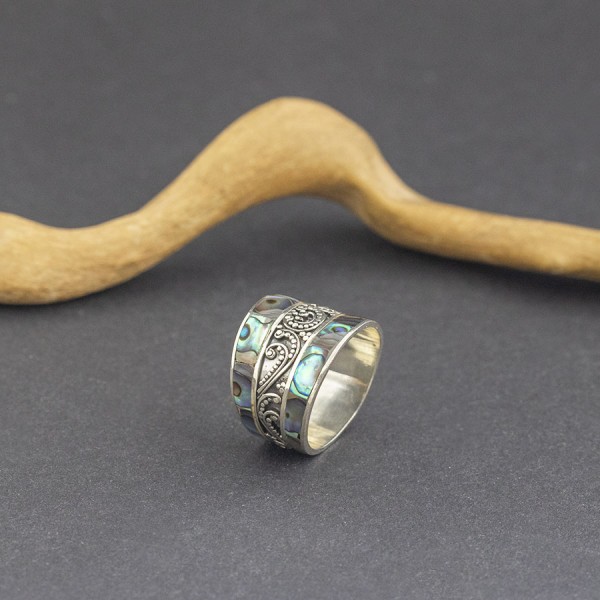 Pierścionek od podstaw wykonany ręcznie ze srebra próby 925 oraz muszli paua. Całość zdobień wykonana została ręcznie pracochłonną techniką granulacji. Szerokość pierścionka w najszerszym miejscu 16 mm; w najwęższym 9 mm. Rozmiar jubilerski 18.